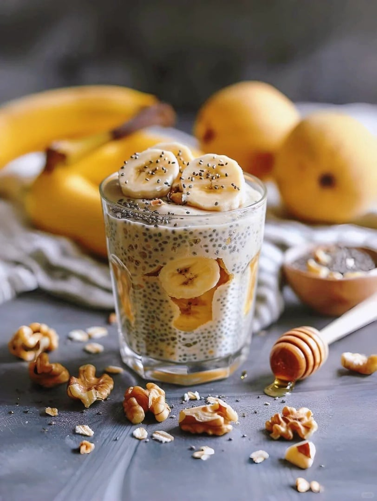 Step.1️ 奇亞籽用牛奶沖泡後,浸泡10-15分鐘讓其吸水膨脹,再放入香蕉片