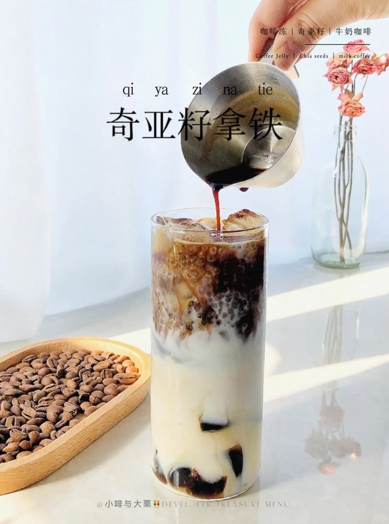 讓拿鐵喝起來更滑順的秘方,就是加入「奇亞籽」!小啡与大栗?在小紅書上分享的另一款奇亞籽飲品,也超驚喜!奇亞籽和奶類超級配,融合後不會影響拿鐵的風味,反而會有加分的效果,在家就可以做出一杯高顏值的下午茶。想要增加口感的話,小編推薦可以加一點咖啡凍,會更好喝喔!