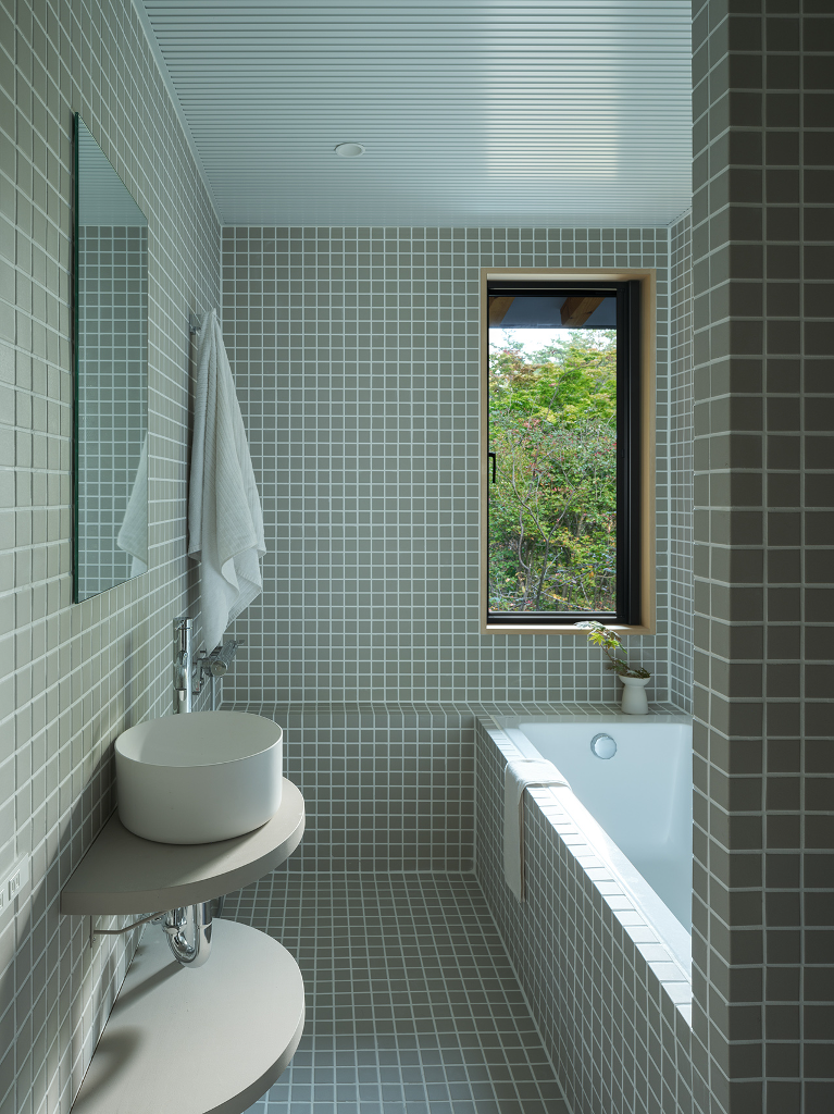 開放式廚房與餐桌,讓客廳空間有了溫度,捨去電視牆與現代科技的華美裝修,木質調性滿盈空間,從室外到室內,都能感受滿滿的芬多精。臥室也僅以拉門區隔客廳空間,讓夜晚也能夠有森林的聲音作伴共眠。走進浴室,綠色馬賽克磚拼滿浴室空間,完美地將公共區域區隔開來,多了一點神秘卻趣味的氛圍,設計師同樣在浴室設計了一扇朝向森林的窗戶,讓屋主在洗浴時,能一邊泡澡一邊賞景。屋主可以在「沐浴森林之家」與大自然一起度過美好的假期,他們可以在這裡散步、奔跑、騎自行車、滑板等,一起與大自然度過了健康且幸福的假期。