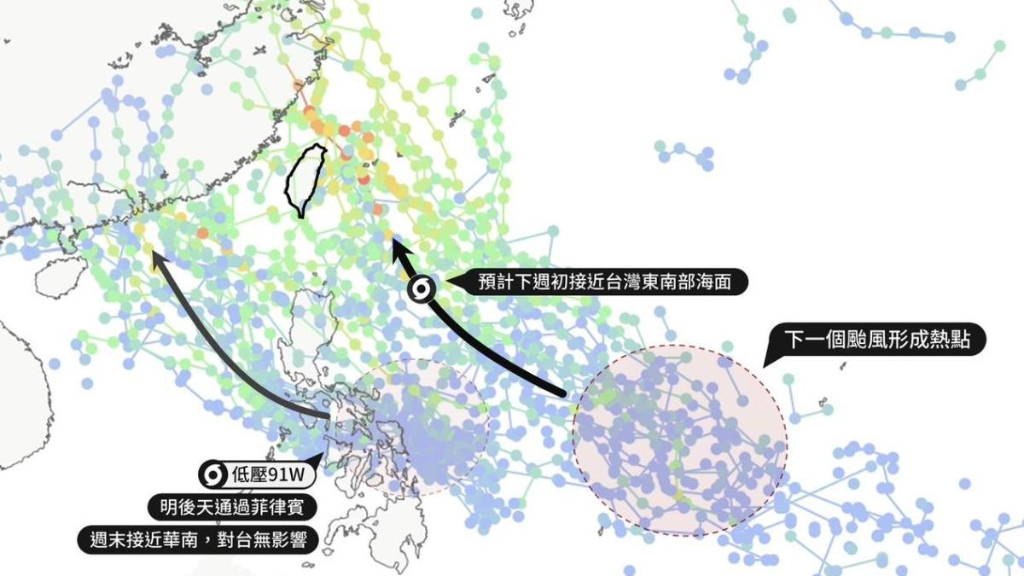 粉專也曬出未來10天低壓路徑系集圖,畫面中可見,將有個颱風形成熱點,而且將一路北轉往台灣方向來,預計下週接近台灣東南部海面。對此,粉專也強調,這張圖並不是在說颱風馬上要來了,而是「台灣顯然在未來路線的射程範圍內」。