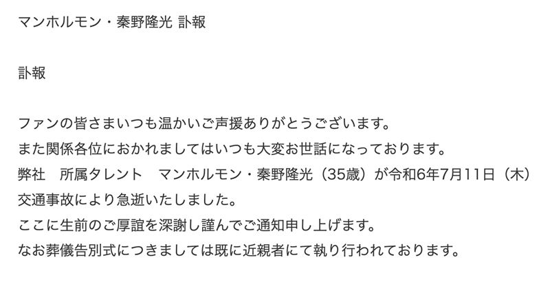秦野隆光的經紀公司今發表聲明:「感謝所有粉絲的熱情支持,我們也要感謝所有相關人員的持續支持,藝人秦野隆光(35歲)於2020年7月11日因交通事故突然去世,葬禮已經由近親舉行,願故人好走。」搭擋小田桐雄磨也悲痛表示:「所有人都還在震驚和悲傷中,葬禮已經結束,希望好搭擋一路好走。」