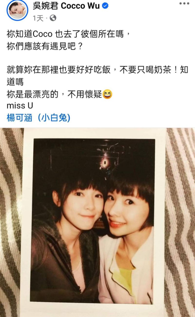 吳婉君在臉書中還貼出兩人的自拍合照並且寫下「想念妳」,可見她和楊可涵的感情相當好,不少網友見狀也留言「想念小白兔了」、「時間真的過得好快」。其實,楊可涵在生前憑藉電視劇《新世界》入圍金鐘獎最佳女主角,演技備受肯定,她也擁有一副好歌喉,當時離世也讓不少好友相當難過。