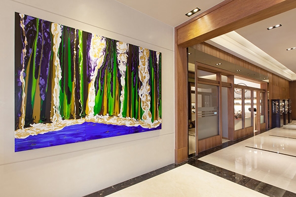 【圖說】一樓大廳陳列台灣當代藝術創作(圖為藝術家瑪馨玲的作品:合氣一相/水唱‧同暢春江遊)。