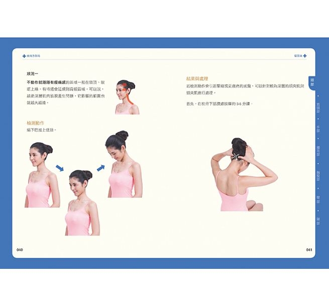 1.先檢測,再處理:單一部位痠痛可能牽涉不同肌肉群,先使用自我檢測方法,簡單幾個動作就能找到痠痛的真正原因,才能真正舒緩痠痛。