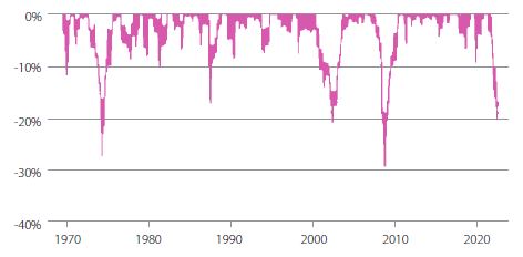 1970~2022年之間,虧損幅度較大的時期,股價下跌了多少?