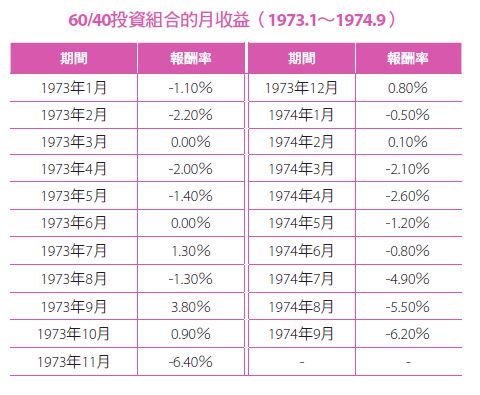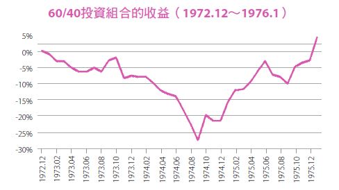 從上方圖表上,我們可以看到60/40投資組合發生大幅虧損的時期。從1973年1月開始到1974年9月為止,60/40投資組合連續走跌了21個月,累積虧損高達-27.54%,直到1976年1月才回到原本的水位。開始走跌後,花了3年的時間才得以回本。
