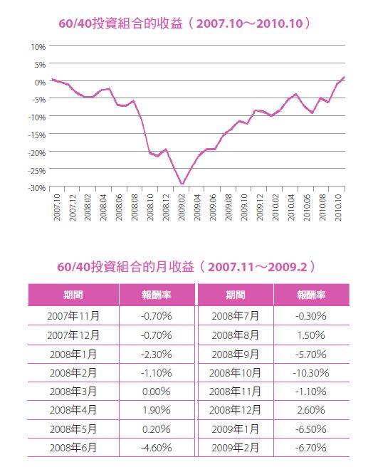 2007∼2008年的表現也是相當乏善可陳。2007年10月到2009年2月歷經了金融危機,60/40投資組合相較於最高點,下跌了-29.7%,從股票開始走跌,這次同樣也是花了3年,直到2010年10才回漲到起跌的價格。在2008年10月,甚至還出現過單月-10%以上的虧損。