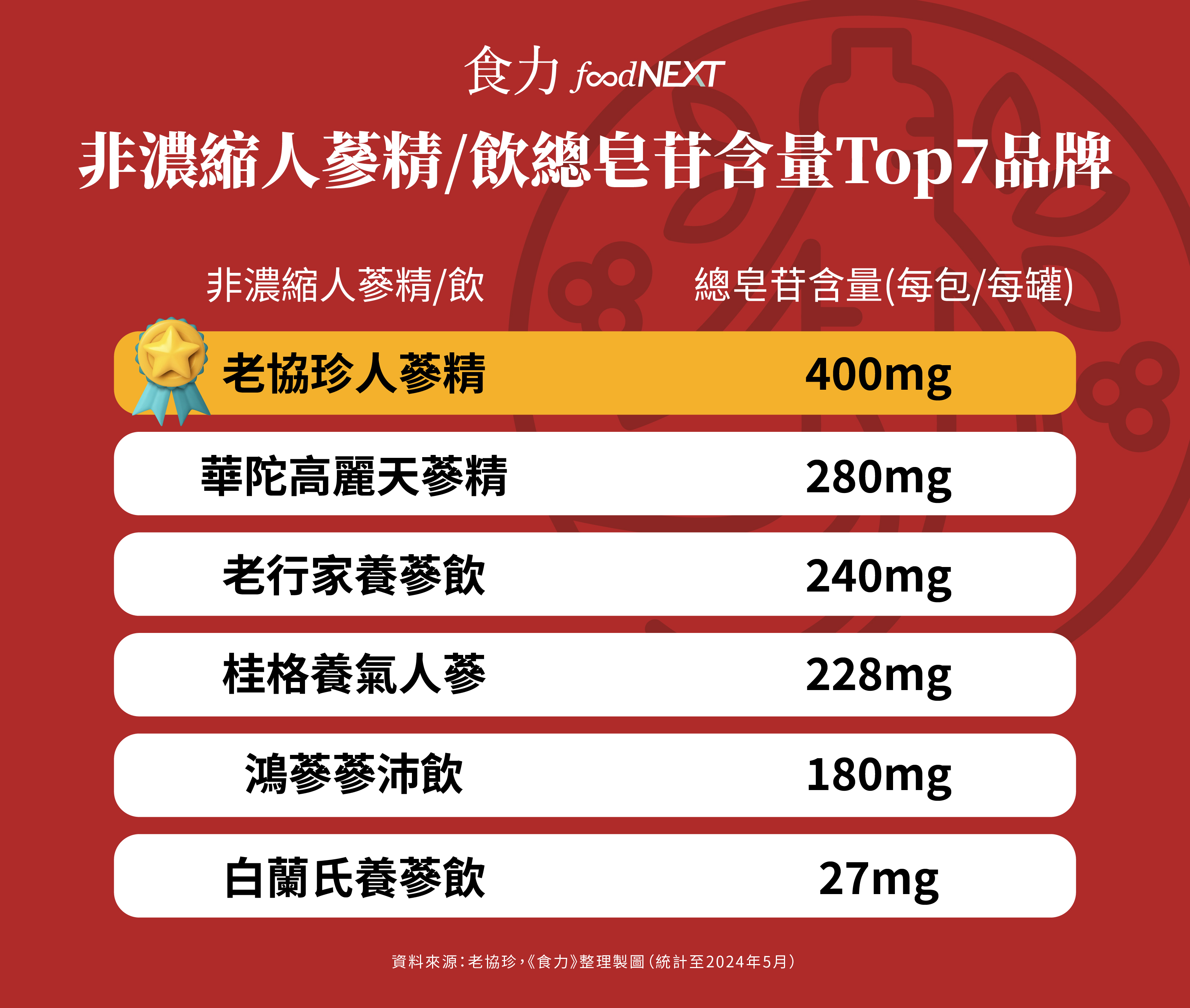 在市售液態人蔘飲中,老協珍人蔘精擁有最高的Rg2皂苷和總皂苷含量,充分發揮了人蔘的補氣功效。資訊來源:各品牌網路揭露數據(包括但不限於產品包裝、官網、廣編文章),人蔘精總皂苷標示含量。