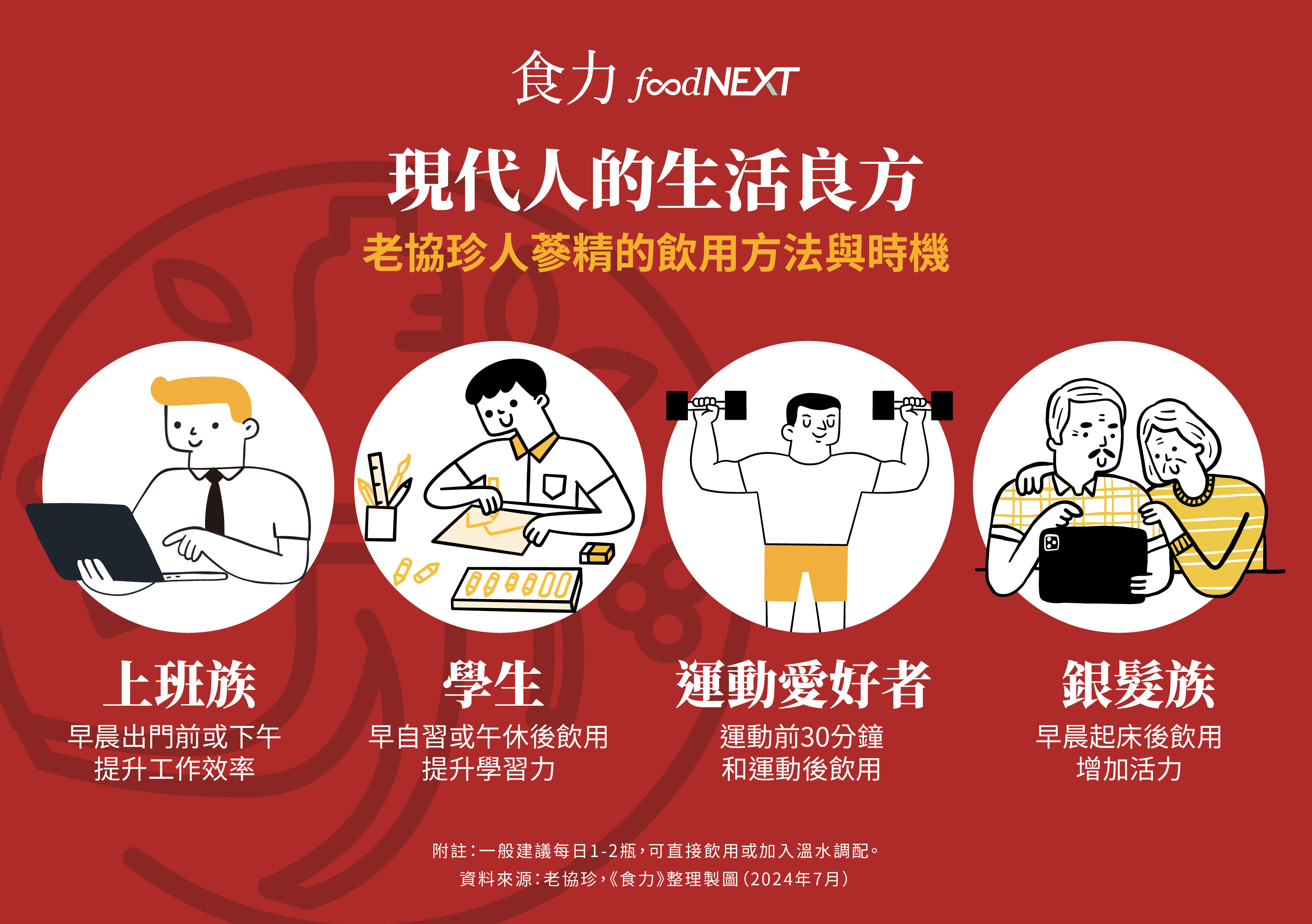 溫和不強補的老協珍人蔘精,是各族群營養補給與補氣養生的理想選擇。長時間高強度工作的上班族可以在早晨飲用一瓶增強體力;也適合面對考試壓力需要提升學習效率與專注力的學生族群飲用;陪伴銀髮族調節生理機能;運動愛好者則可在運動前後補充營養補給。