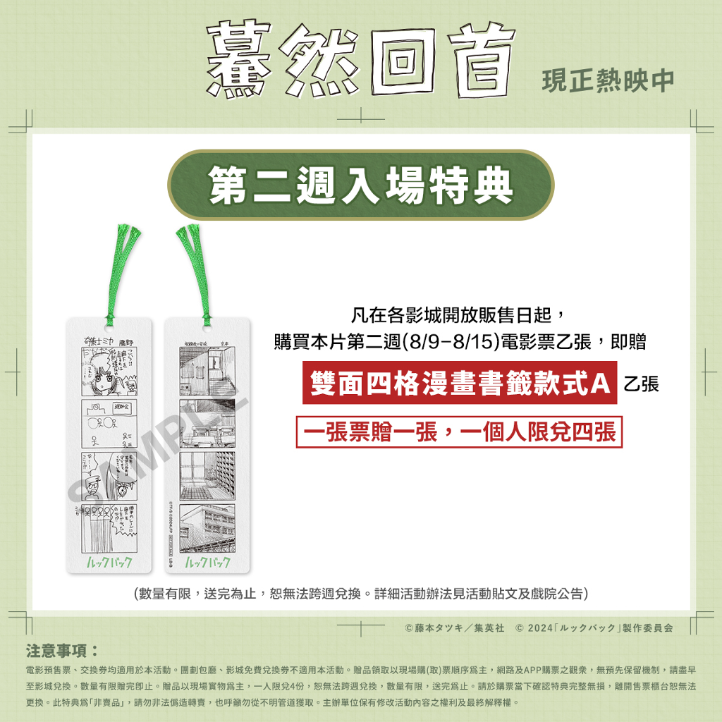 將《鏈鋸人》鬼才漫畫家藤本樹,他的同名短篇漫畫神作搬上大銀幕的《驀然回首》,在台上映後好評不斷,從一般民眾到各領域名人,都在觀賞後紛紛寫下推薦,美譽本片「絕對是今年必看之作」!不論是戲院的觀賞人潮,或是在社群上的推文密度,都傲視其他上映電影,也讓本片不負眾望,一舉奪下首週末新片票房冠軍,上映四天的累積票房更直逼1700萬,也讓各界看好本片有望繼《SPY x FAMILY CODE: White》、《排球少年!! 垃圾場的決戰》、《名偵探柯南100萬美元的五稜星》之後,挑戰成為今年第四部有望破億的日本動畫電影。台灣發行商也乘勝追擊,在今日(8/5)公佈本片「第二週入場特典」,只要在各影城開放販售日起,購買本片第二週(8/9-8/15)電影票乙張,即可獲得遠從日本原裝空運來台的「雙面四格漫畫書籤款式A」乙張。每人每次至多限兌換四張,數量有限,送完為止,勢必將再現戲院兌換特典的排隊人潮。
