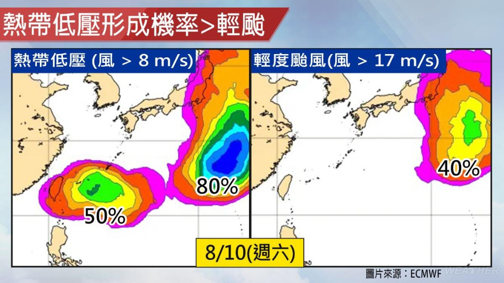 天氣風險指出,週末期間(10至11日),台灣東邊的低氣壓有逐漸減弱並且向東移動的趨勢,慢慢併回東側大範圍的低壓環流中,隨著低氣壓遠離,台灣附近又會回到太平洋高壓外圍偏南到西南風環境內,迎風面的中部以南沿海地區夜晚清晨有局部短暫陣雨,其他地方則還是會有局部午後熱對流雷雨機會,整體雨勢會較為減小一些。