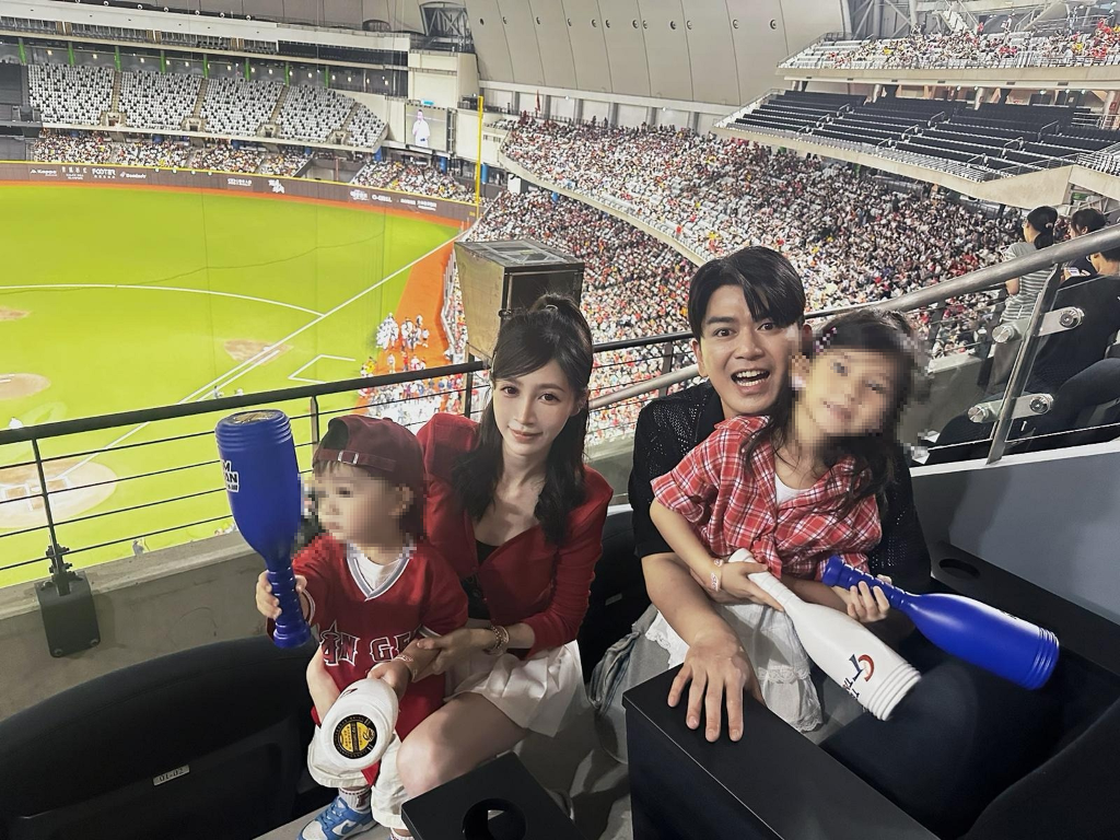 ▲ 潘逸安(左二)帶全家觀賞棒球比賽。(圖:艾迪昇傳播)