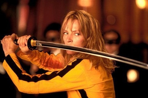 片中這位穿著黃色連身運動服,拿著日本名匠武士刀大殺四方大噴血漿的女殺手