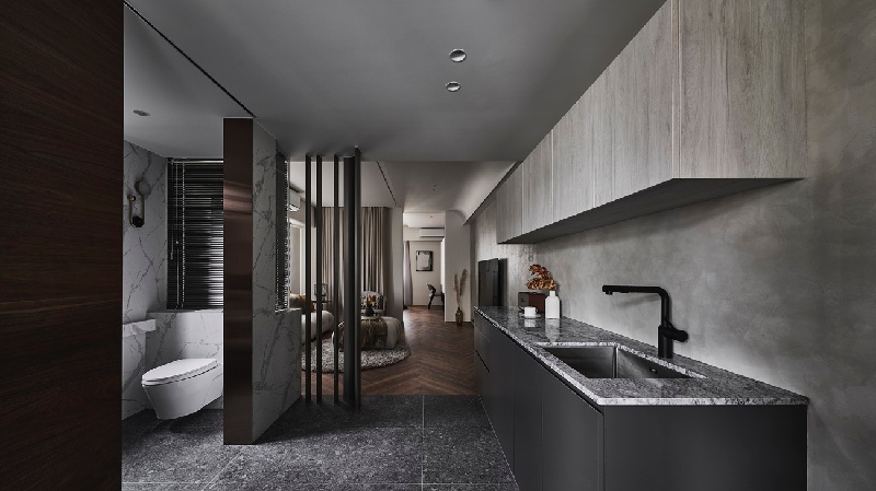 玄關門後的廚房與衛浴區,以帶有深邃色調的地坪材質劃出相同情緒。