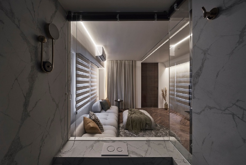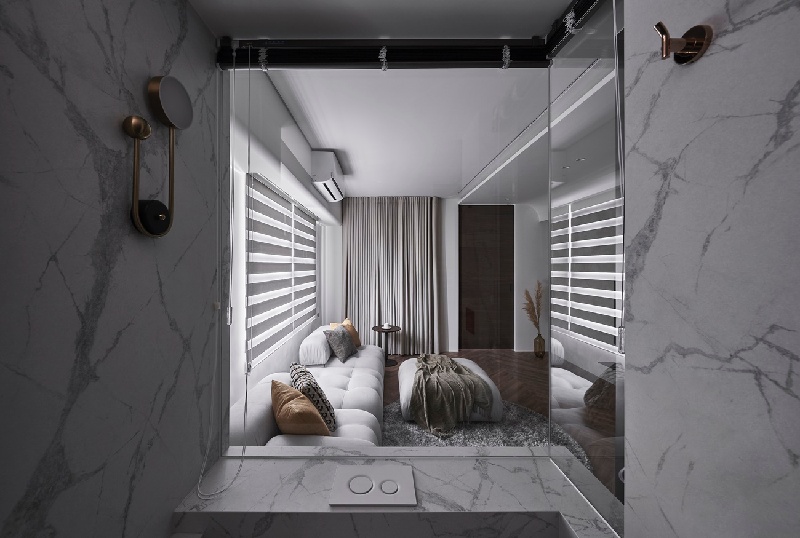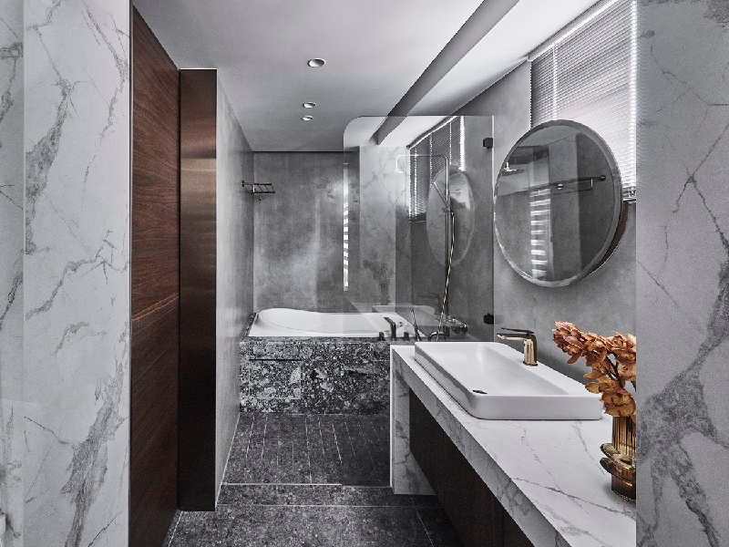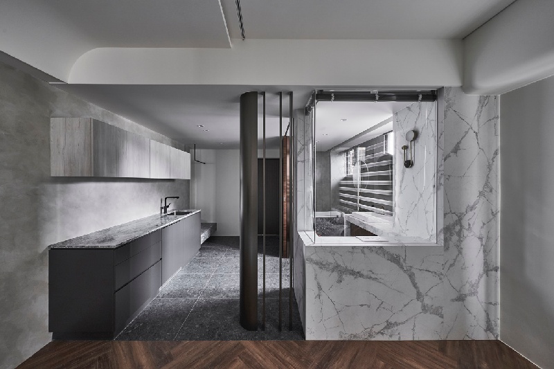 鑒於自然採光在原先格局上較不易涵蓋到玄關區,設計師便採用了半開放式的概念來規劃衛浴區,讓光線得以延伸到內部的餐廚玄關區。並透過帶有古銅鍍鈦襯搭的胡桃木拉門、淨白大理石薄磚圍塑出一股優雅低奢,使旅途的舟車勞頓得以隨層次淡去。