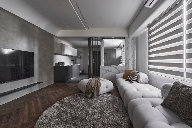依循連袂全室的灰色調藝術漆牆入內,胡桃色人字拼井然有序,砌起了客廳至臥房的溫潤感受,亦藉此延伸空間感。考量到長型格局的特性,適當導入弧形斜角修飾客廳天花,且運用燈帶特性,消弭結構樑的壓迫感也柔化視覺銳角。