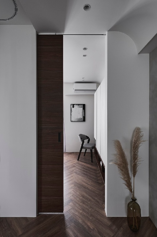 公私場域處處相映成趣,其空間界定採用和衛浴相同的胡桃木拉門,使視覺維持一致不至於凌亂。