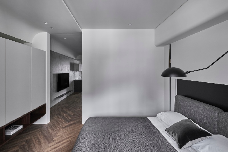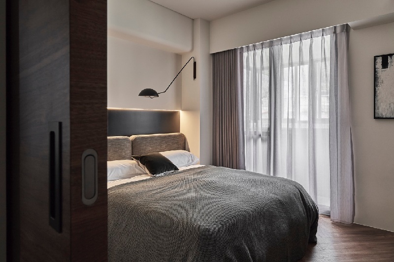 設計師同樣運用弧形元素,化解臥房床頭上方的樑柱壓迫感,並藉床頭封板消弭風水及感官上的疑慮,讓全室白皙與地坪暖意沉澱一日疲倦。