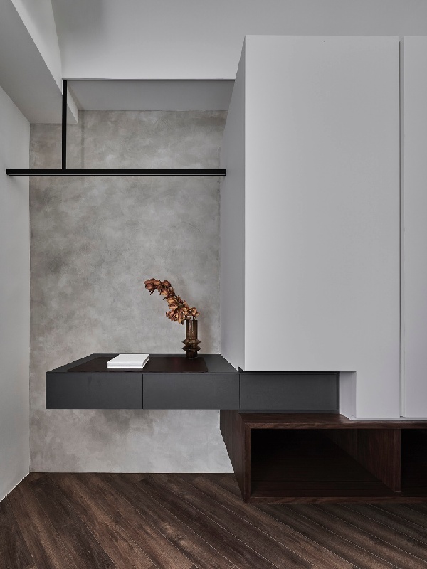 臥房承襲公領域的簡練調性,在床尾設計鏤空衣櫃與自其中延伸而出的一體成型書桌,彰顯現代風十足的簡約美學,也滿足家人在旅行期間偶有需要書寫作業的需求,書桌上方的樑柱規劃了由鐵件線條構成的簡約燈飾,與玄關的衣物吊桿形成格局頭尾呼應的視覺設計。