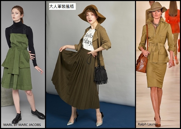 大人感風格延續到2015的春季,比較不同的是運用了軍裝風的style,但並不是指要使用迷彩圖樣,而是投入軍裝感的顏色例如:墨綠色&焦糖色,再混搭簡約的單品就OK!