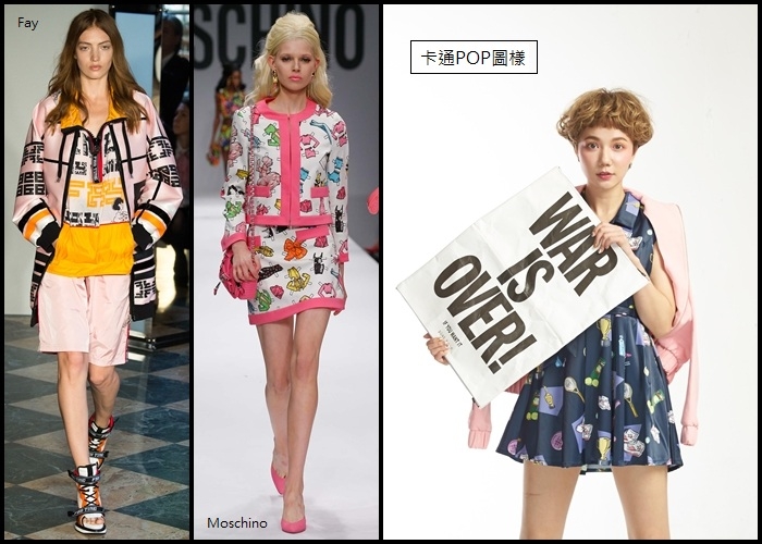 隨著國際品牌紛紛推出翻玩卡通的款式,繽紛的塗鴉熱潮又再度出現在春天單品中。利用飽和顏色製造出撞色效果,並且印製上可愛有趣的圖樣,打造出復古的街頭藝術風格。