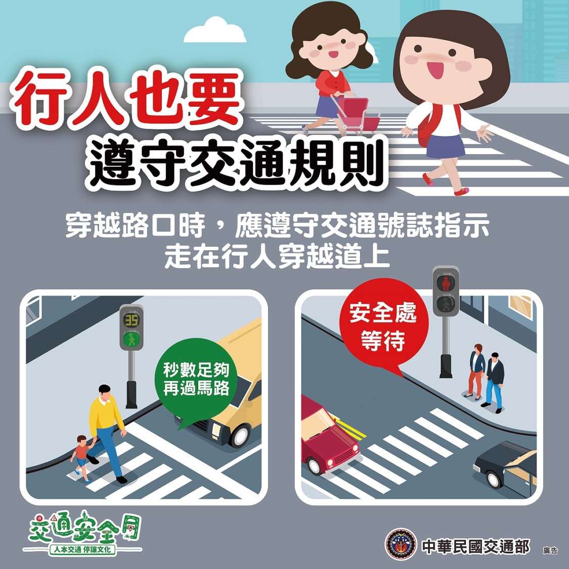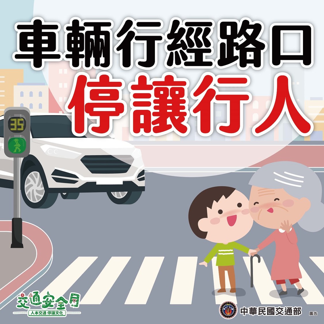 〔News586/記者郭政隆報導〕交通部自109年起,每年訂於9月辦理「交通安全月」,藉此強化宣導國人道路交通安全觀念,今年主題以「人本交通-停讓文化」推動行人優先的「停讓文化」,並以口號「車輛慢看停 行人安全行」宣導,主軸包含「車輛行經路口停讓行人」、「無號誌路口遵守停讓」、「至路口中心點在轉彎避免死角」、「行人遠離車輛,安全處等待通行」、「走行人穿越道,不任意穿越車道」、「遵守號誌,綠燈秒數足夠再過馬路」、「專心過馬路,不滑手機」,期以喚起民眾交通安全意識,也使停讓觀念得以深入日常。