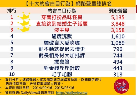相信大家多少有過這樣的經驗,自以為初次約會氣氛還算掌控得宜,之後卻再也沒有接到對方的主動聯繫,你以為是對方出了什麼事,卻從來沒有好好反省自己是否就是太過於「做自己」,今天DailyView網路溫度計就要來一文打醒夢中人,一起來看看「十大約會白目行為」你中了幾個?