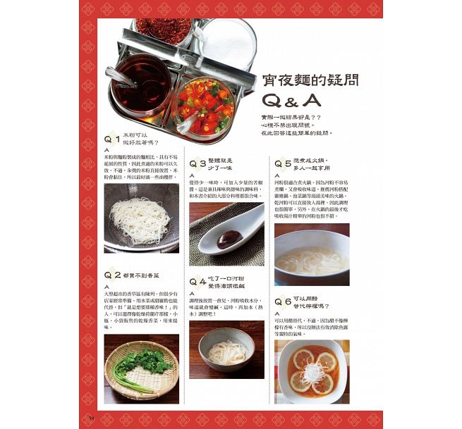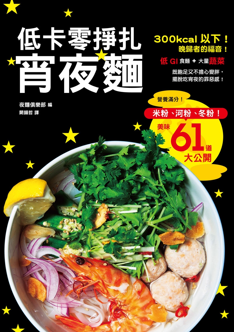 本書使用的麵類,是以米和綠豆為原料製成的亞洲麵(米粉、河粉、冬粉),搭配青菜,偶爾小奢侈一下,加點醬料或是蛋(需要注意熱量唷!),自己也輕鬆製作出美味與營養兼顧的豪華宵夜麵。