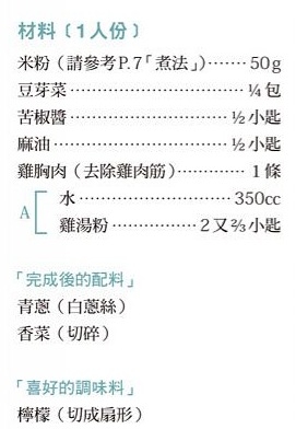 作法: 1. 在碗裡放入豆芽菜、苦椒醬、麻油,攪拌混和。 2. 鍋子裡放入材料A煮沸,放入雞胸肉加熱煮至熟透,起鍋絲成小塊。 3. 在步驟2的鍋子裡加入米粉煮2~3分鐘,起鍋裝盤。將步驟1的豆芽菜、步驟2的雞胸肉及「完成後的配料」放入,擠上檸檬。 |