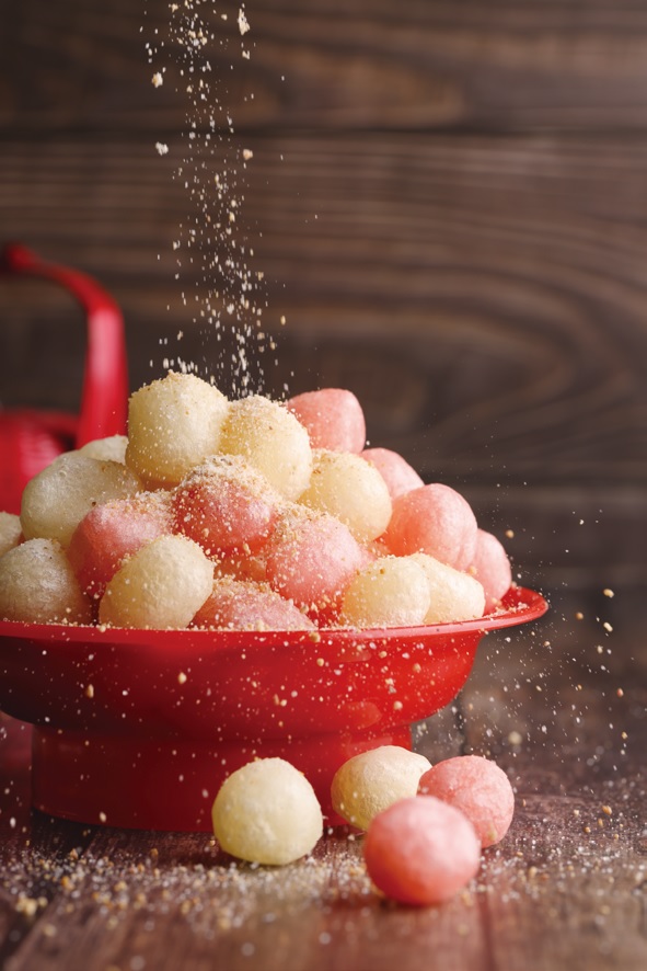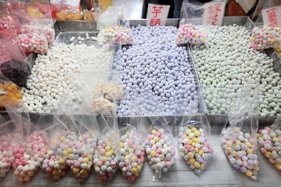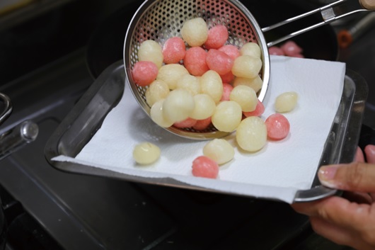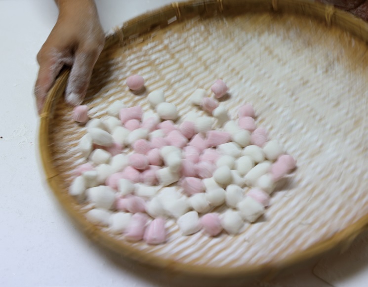 1. 在紅白小湯圓表面均勻撒上太白粉,備用。