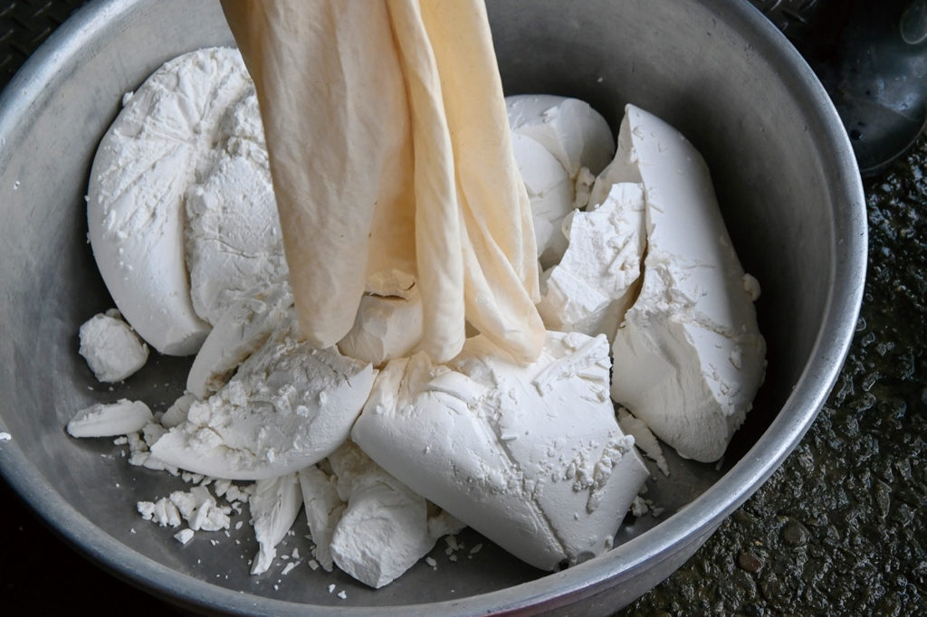 3. 壓粿:將米漿倒入粿袋,綁好綁緊,以前的人會用石頭和扁擔重壓,去除水分後即成生粉塊。
