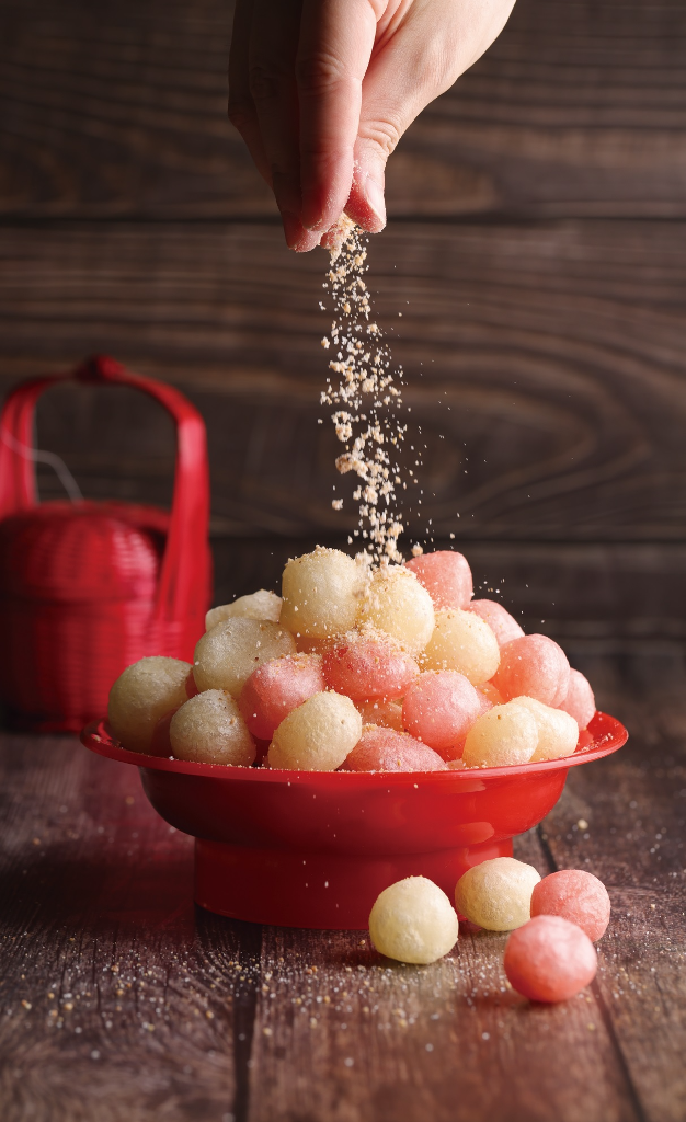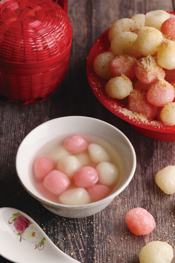 紅白湯圓除了甜湯版本外,還會以另一種吃法出現在台灣人的喜宴上,就是很適合當成開場與壓軸的點心――花好月圓,即炸湯圓,尤其受到小孩們的喜愛。總舖師為了配合喜宴菜名,讓原本樸實無華的小湯圓進了炸鍋,沾上花生粉,就成了「花」好月「圓」的圓滿如意,祝福新人早生貴子。
