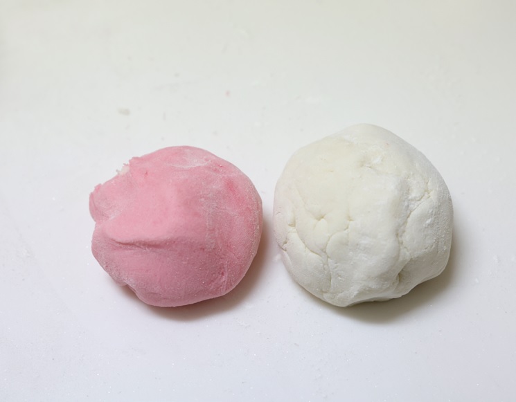 3. 將煮熟的粿酺(婆)放回糯米糰中,繼續揉勻成不黏手的狀態,分為兩等份,一份為白色,另一份以紅色色素染成粉色。