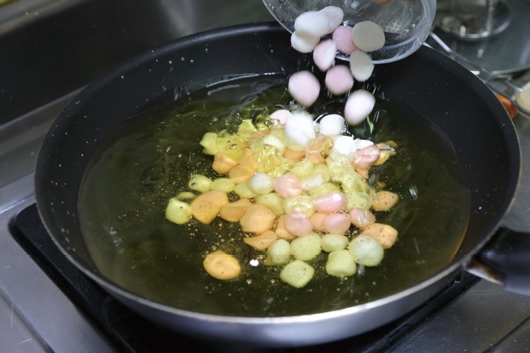 2. 準備油鍋,油溫約50 ∼ 70℃時,放入小湯圓,以150℃油溫慢慢炸熟至表面產生疙瘩狀,撈起瀝油,再撒上花生糖粉(事先拌勻)即可。