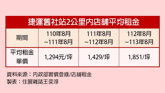 機捷特區儼然成為台中新興的時尚生活圈,租金行情也水漲船高。根據內政部實價網站租金調查,捷運舊社站2公里內的店舖租金行情,從2021年的每坪1,294元躍升到2024年每坪1,851元,平均租金漲幅達43%。