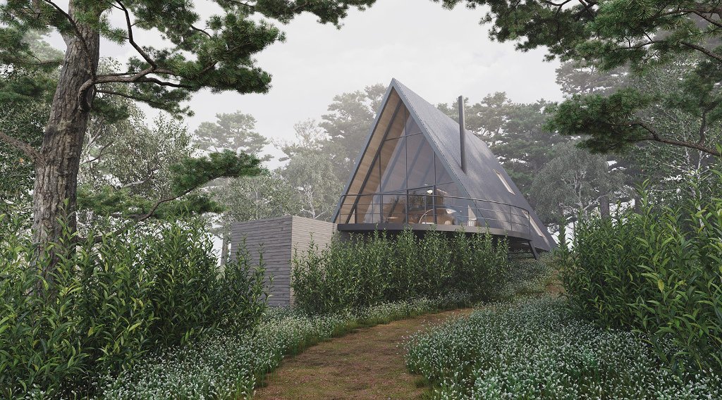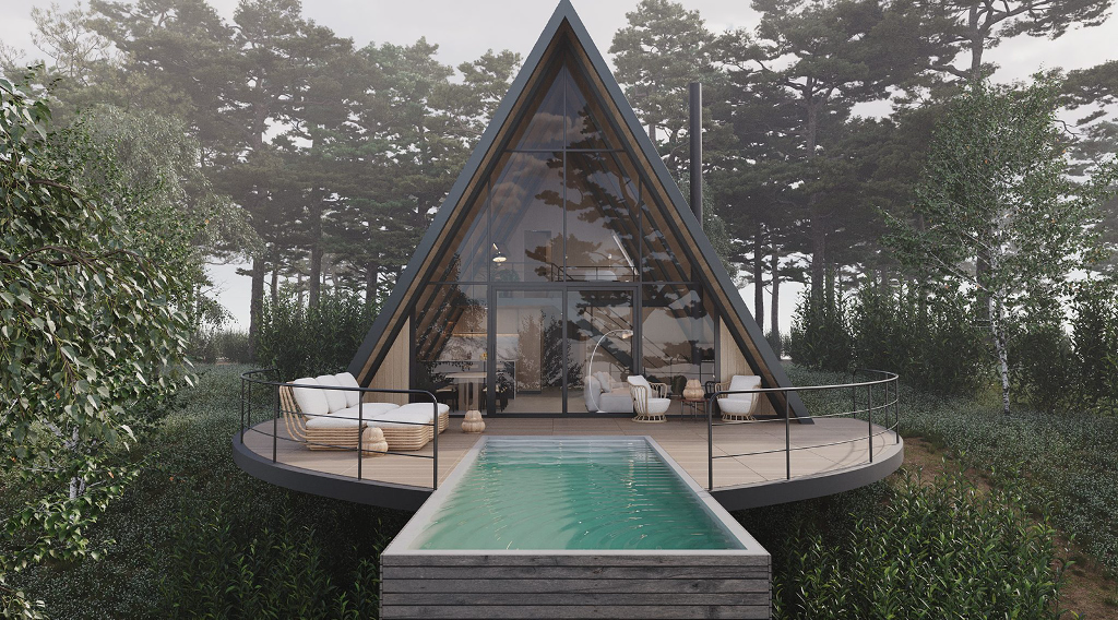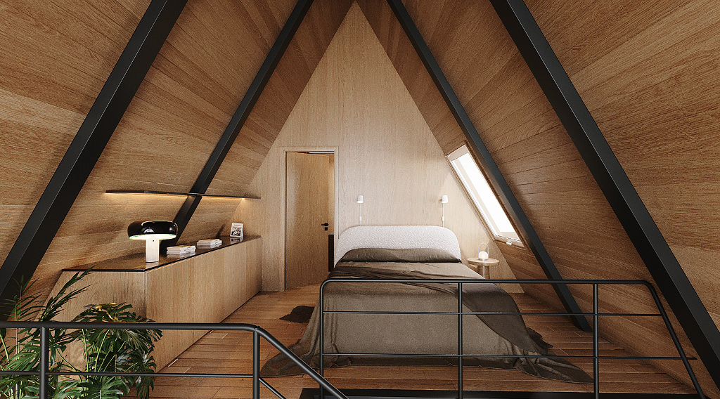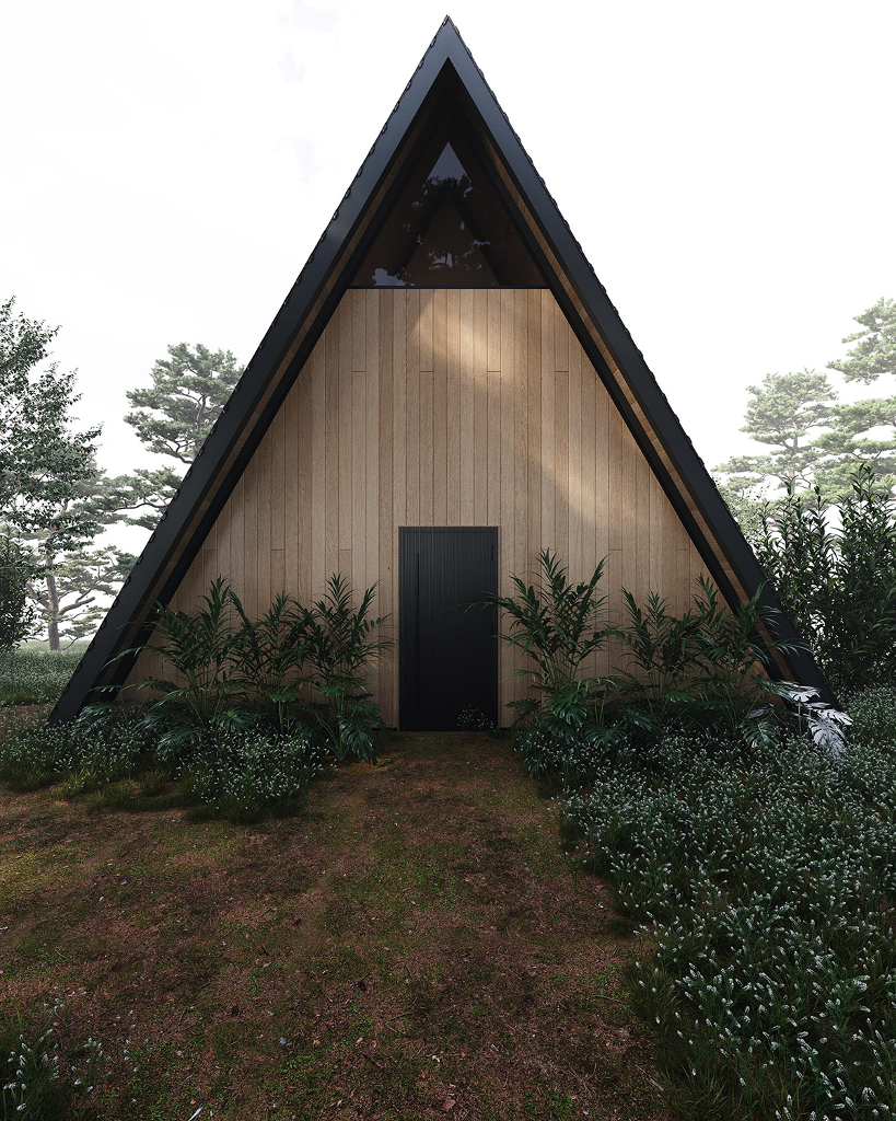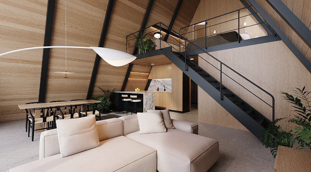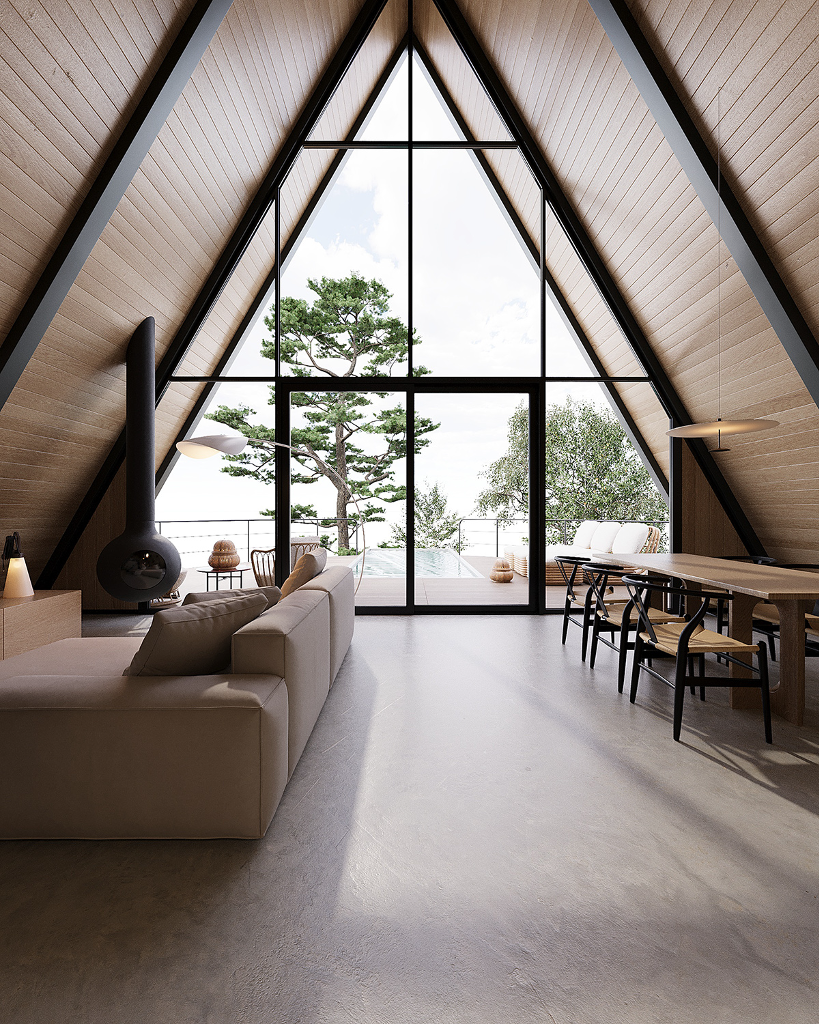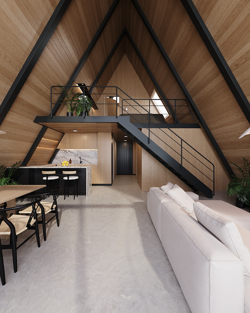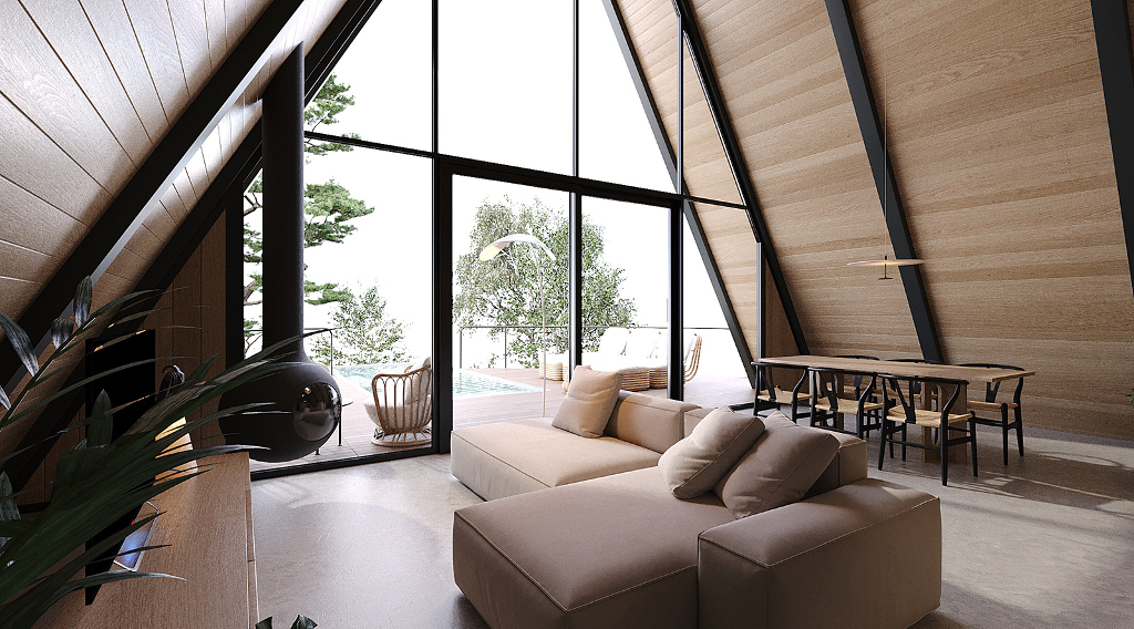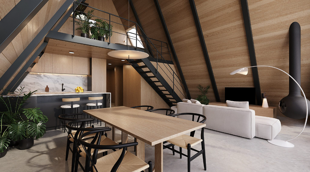 小木屋結構採用輕鋼架(LSF)技術的A字型外觀,室內大量使用木料,如此一來既保證了結構的穩定性,也增添了自然質樸的柔和氛圍,並且實木的溫暖質感與鋼材的現代感相結合,形塑出獨一無二的美學效果。屋內的風格精緻、功能齊全,足以讓一家人於美景之下樂活過日。室內共有兩間臥室、兩間浴室、一間廚房、一間餐廳與一個客廳。特別的是還規劃有一個閣樓,大幅增加了空間的靈活性及趣味性。