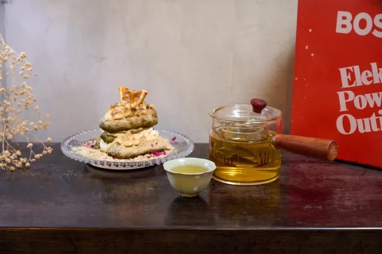 ▲ 疲倦走走漢方熱茶:採純中藥沖煮,不含咖啡因,可以嚐到青草、菊花、枸杞和紅棗香;創新的橙酒麵茶提拉米蘇賣相和滋味獨特。