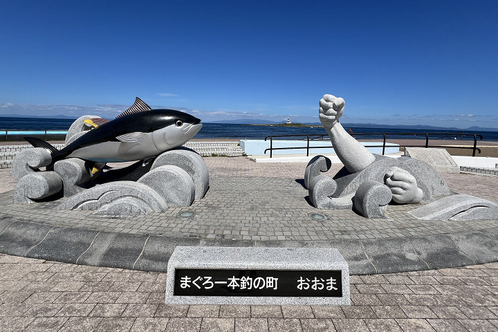 大間町位於下北半島,大間崎為本州最北端之地。此外當地更以黑鮪魚聞名,經驗老道的漁師們只在一條釣線上掛起1個或數個活魚餌鉤,吸引大魚主動上鉤的「一本釣」釣法也是一大特色。當地的黑鮪魚品質極為優良,有「海洋的黑鑽石」之美稱,更註冊了「大間黑鮪魚」商標,且在2019年創下結標金額達3億3,360萬日圓的天價。鎮內的黑鮪魚一本釣雕像與日本最北端紀念碑,都是遊客到此必拍的紀念照。