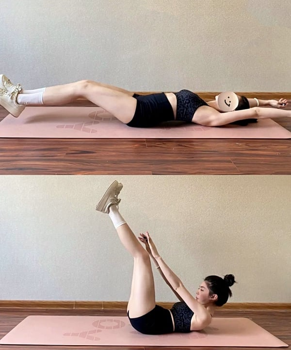 平躺於地面上,雙手往上伸直過頭,吸氣時用腹部力量將雙腿及雙手抬起、盡量讓雙腿及雙手可以相碰即可,吐氣時再回到原始動作。這個動作注意施力點以腹部為主,可以運動到整個腹部的肌群,尤其針對下腹部更有感。