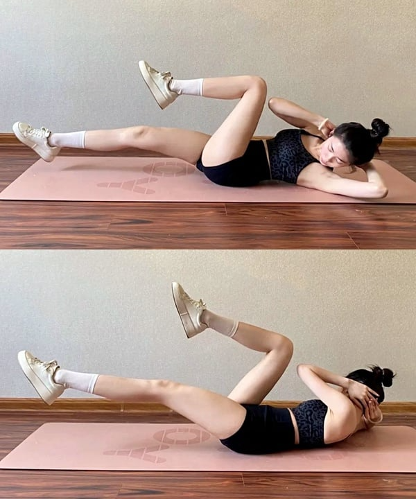 一樣維持屈膝躺姿,用腹部的力量將上半身微微抬起後,雙手手臂伸直,輪流觸碰鞋跟部位,這個動作可以進一步針對側腰線的鍛鍊,練出纖細小蠻腰!