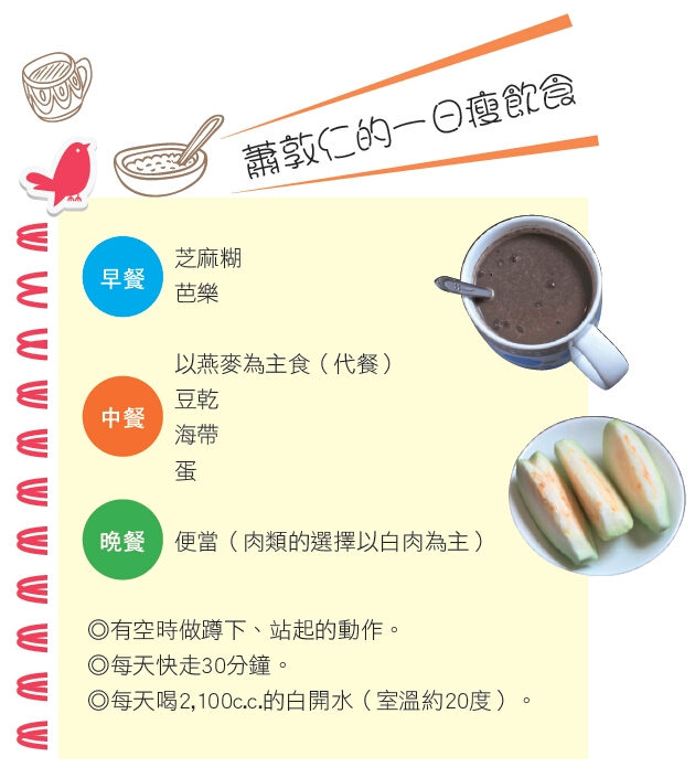 身為減肥專科醫師,這十餘年幫助許多人減重,他比誰都明白瘦身的辛苦,減掉脂肪的關鍵因素——「壓力的解除、充足的睡眠、適當的運動、均衡的營養。」環環相扣,缺一不可!蕭敦仁說,不想動、疲倦時請好好休息,睡眠永遠比運動重要,要睡飽才不容易餓,每天給自己6〜8小時的好眠才有好體力,也才會想運動。