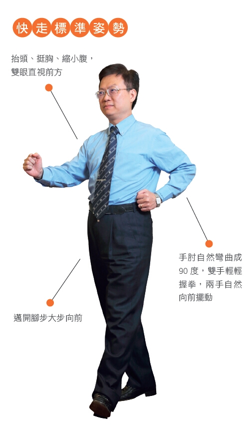 快走時,請抬頭、挺胸、縮小腹,雙眼直視前方,手肘自然彎曲成90度,雙手輕輕握拳,兩手自然向前擺動,邁開腳步大步向前。