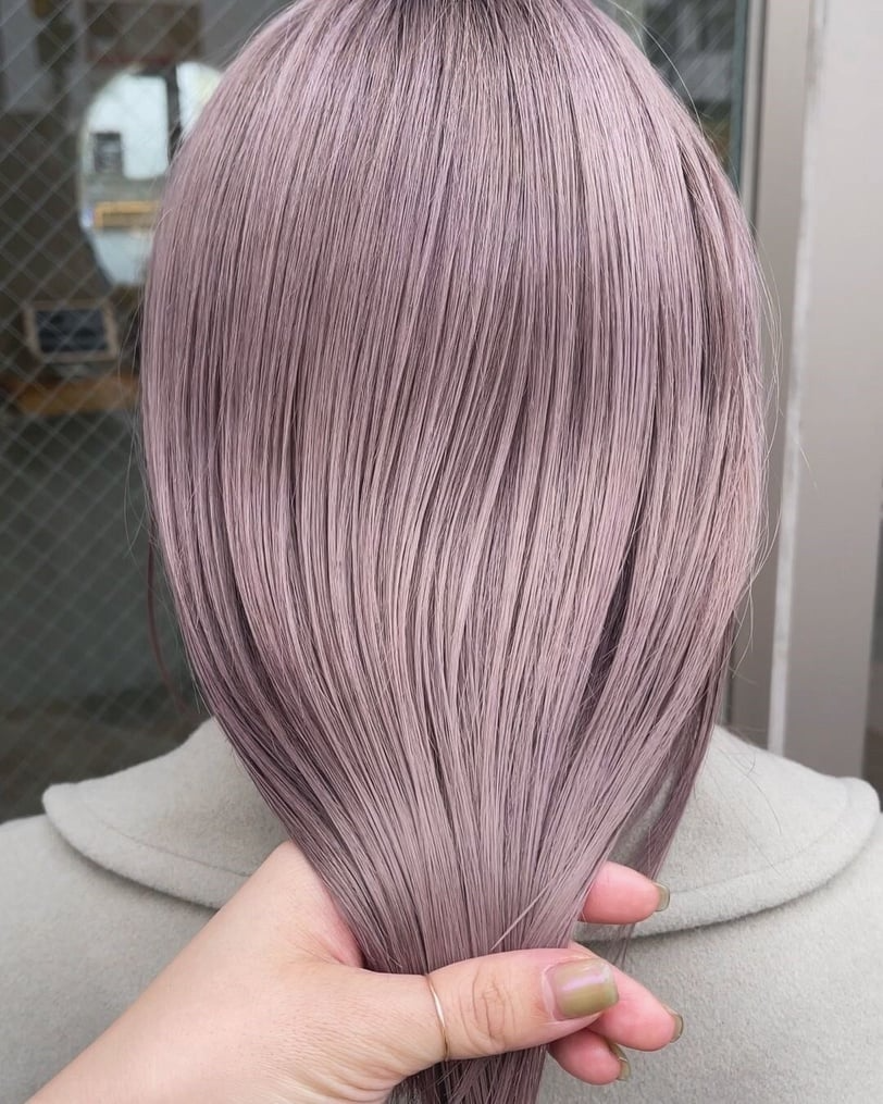 如果覺得前面幾款都太過於乖巧日常,想來點變化,不妨試試這款溫柔的薰衣草米褐色!染後髮質看起來是霧面質地,更不顯毛躁、分岔,髮質相對看起來會更好更柔順,且低飽和度的紫色也更好駕馭、即便素顏也不奇怪,絕對是蠟黃暗沉肌的顯白髮色,整個人呈現柔軟輕盈的氣質。