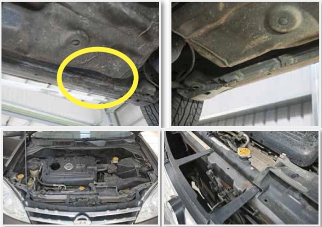 從水箱架、葉子板、擋火牆、門檻焊點與A柱內側整修等狀況可判斷這輛車曾經遭遇相當明顯的撞擊事故,如果你檢查車輛時已經察覺到這些異狀,可千萬不要考慮這輛車以免後患無窮,我們特別將車輛頂高,打算仔細看個清楚。這輛車的底部有明顯油漬,引擎油封、機油卸油孔、變速箱、傳動軸等位置都有可能漏油,原則上盡量選擇車底乾燥無油漬的車為佳。