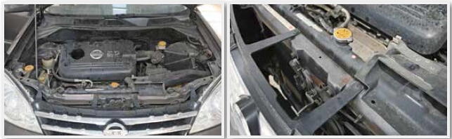 掀開引擎蓋看仔細是檢查車況的標準作業流程,左圖這輛車的引擎室看起來有些糟糕,油漬、灰塵、水箱架與螺絲鏽蝕狀況頗為明顯,如果引擎室經過清洗反而看不出原貌。右圖的車頭水箱架似乎經過碰撞整修,在接合處可看到明顯鏽蝕。