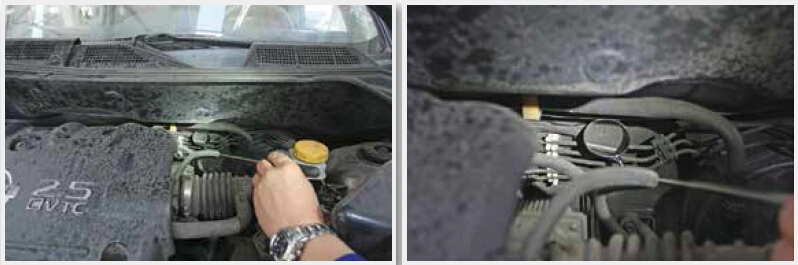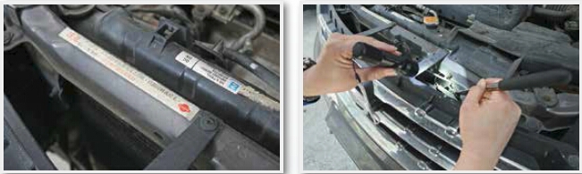 水箱架上面有風扇運轉警示標籤,看起來是原裝貨,仔細看可發覺水箱架表面不平整,警示標籤也有撕下重貼的痕跡,看起來大有問題。發覺有異狀時,車輛檢驗技師(查定士)會採用反射鏡子與強光手電筒,仔細檢查水箱架內側是否有整修熔接痕跡。經過手電筒照射,從進氣壩可看到下水箱架經過切割整修而有生鏽與不平整的狀況。