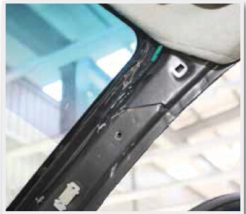 拆下A柱內飾板可看到結構內側有重新接合痕跡,接合處已經開始生鏽,前擋風玻璃密合膠不平整,顯示擋風玻璃也更換過,不僅車體結構有問題,車頂也整修過。