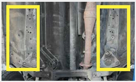 在手電筒照射下,右前門檻位置可看到鋸齒狀夾具施工痕跡,表示這輛車曾經因為明顯事故而用工具夾緊、進行整修結構的動作。
