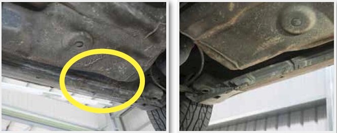 底盤正下方可看到左右兩側的底盤瀝青塗布並不相同,左邊為完整的出廠狀態,有均勻的瀝青跟車底塵泥分布,右邊則有因為維修而刮除原廠瀝青重新噴灑的不均勻分布。