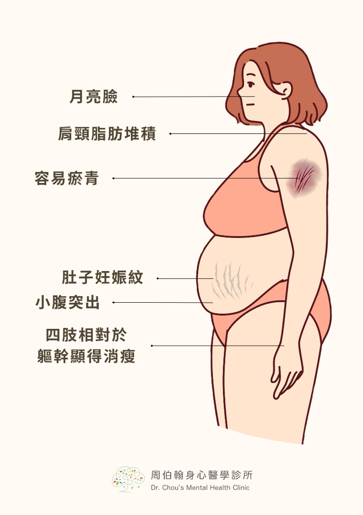 (周伯翰醫師解釋,庫欣氏症候群典型症狀有憂鬱、焦躁不安、易怒、失眠、高血壓、體重增加、中廣型肥胖、月亮臉及水牛肩,也會因皮膚薄而容易瘀青、傷口不易癒合等。)